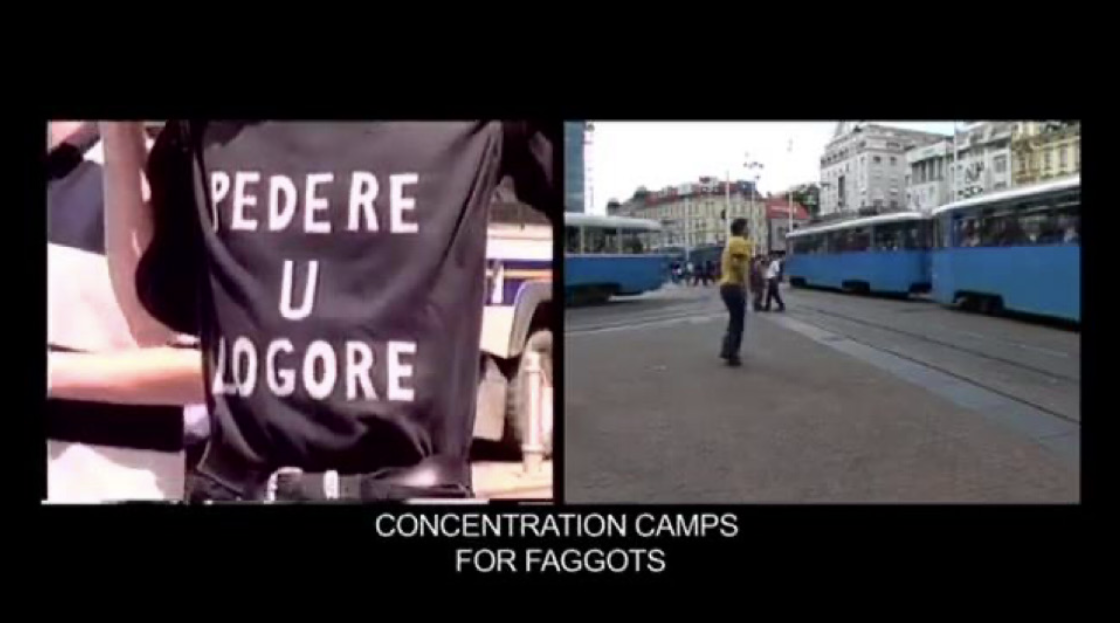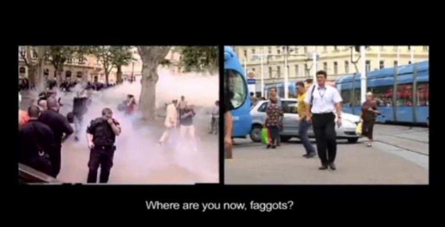 The first of the videos initially begins with a sense of suspense that dominates. We follow shots of armed police who prepare for an eventual confrontation, we move on to shots of protestors of Gay Pride Zagreb standing nervous but undoubtedly proud of their demonstration. All these shots are accompanied by loud music playing in the background. As the music starts to fade, the audience starts to boo and make rude gestures. We then see banners that have words such as “our rights are human rights” as well as “No for gay rights”.
