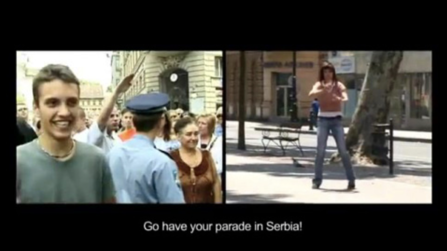 The two-channel projection and performance piece by artist Igor Grubić shows two video works showing the first gay pride parades on the territories of the capital of Croatia; Zagreb, and the capital of Serbia; Belgrade, as well as a performance piece by Croatian dancers who are translating the events and sounds into a bodily reaction.